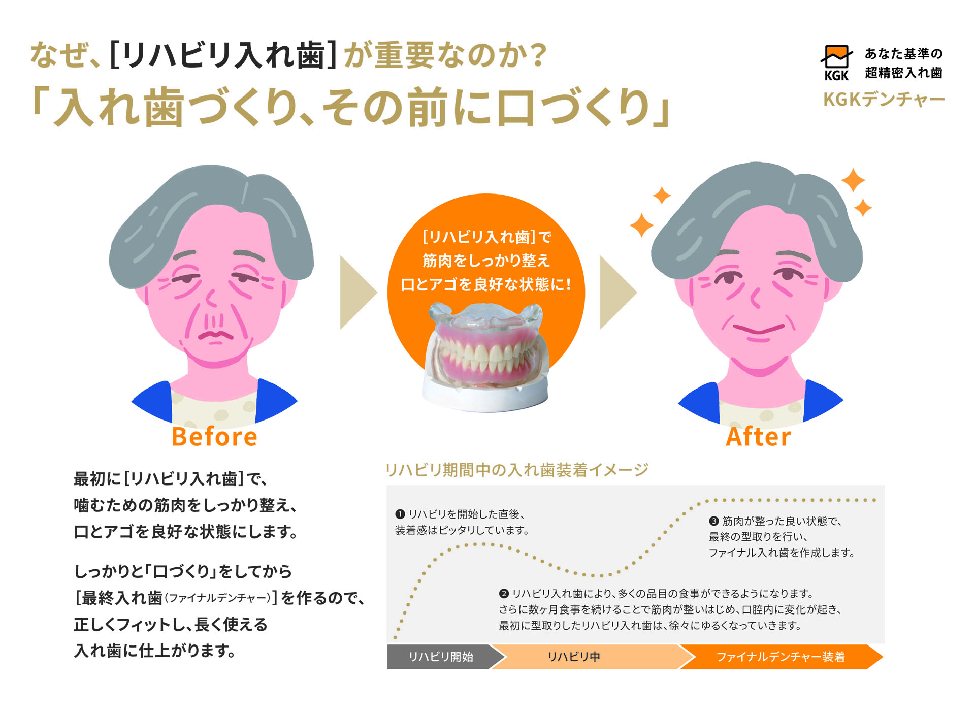 歩行でいえば普通に歩ける、食事でいえば普通に食べられる、そこまで持っていくための入れ歯が「リハビリ入れ歯」なんですね。